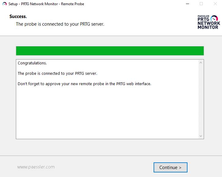 Wait until the installation is complete. The remote probe then automatically connects to your PRTG core server.