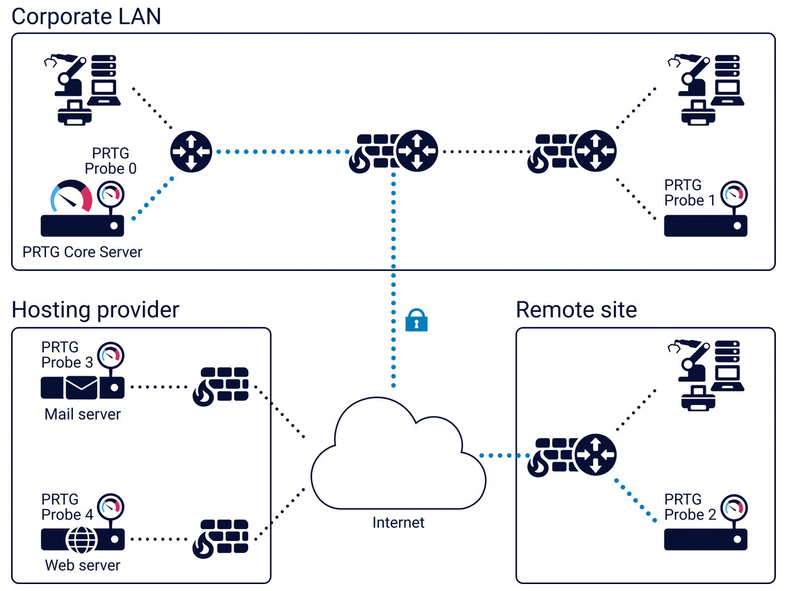 • The PRTG core server is responsible for configuration, data management, PRTG web server, and more.