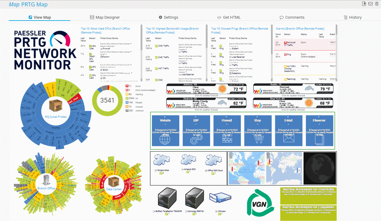 PRTG provides the preconfigured map Sample Dashboard that you can also edit or delete. The map is only visible to administrators. Define a lower priority for the map to not show it under Home in the main menu bar.