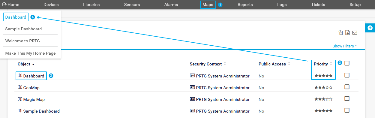 You can also define the priority of a map. Maps with a 5-star priority (i_priority_5) appear in the main menu bar under Home so that you can directly select them. PRTG can show up to 10 entries in the Home menu.
