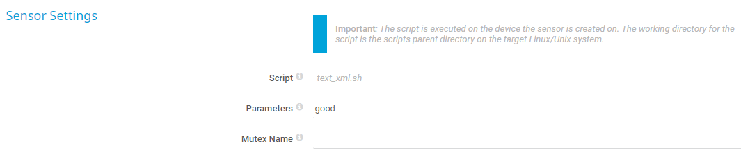 For security reasons, this sensor requires that you store the script file in the /var/prtg/scriptsxml directory on the target system. Make sure that the script has executable rights.